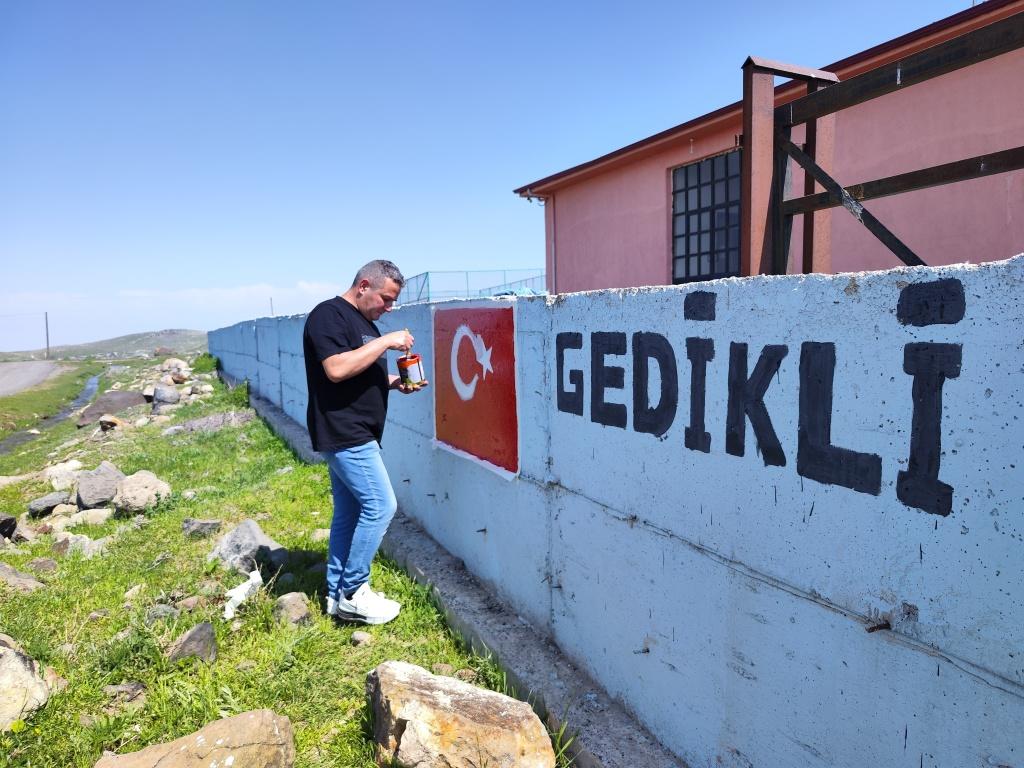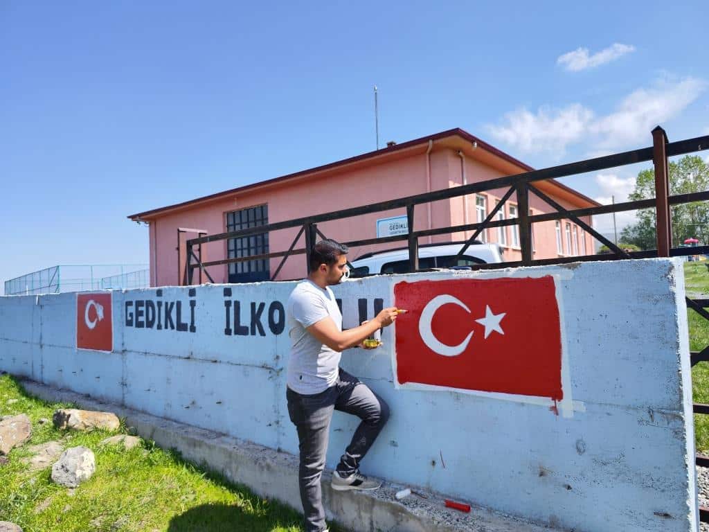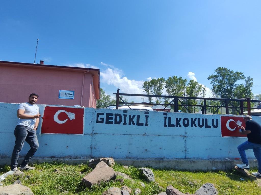 Ziyaretimizde, okulun giriş duvarında bulunan Türk Bayrağı’nın solmuş renklerini yeniden boyayarak bayrağımızın renklerini canlandırdık. Bu anlamlı faaliyet, öğrencilerimize millî değerlerimizi sahiplenmenin ve gelecek nesillere aktarmanın önemini hatırlattı.